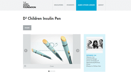 我院工业设计系学生喜获2017年詹姆士戴森设计奖全国亚军9月7日,2017年詹姆士戴森设计奖(The James Dyson Award)公布国家获奖者名单,我院2014级工业设计系蔡雯敏、韩世豪、吕昭宇同学(指导老师:肖畅)凭借作品“D3儿童胰岛素笔 ”(D3 Children Insulin Pen)…
