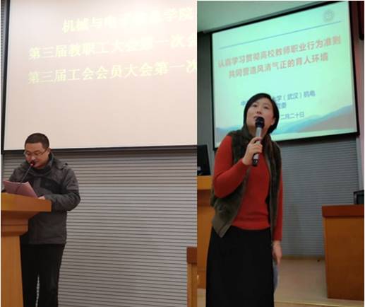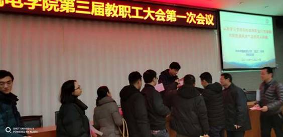 (以下简称机电学院)第三届教职工大会第一次会议暨第三届工会会员大会第一次会议在教二楼301会堂隆重召开。校工会于荣萍副主席及机电学院全体教职工与会,会议由机电学院党委副书记于晓舟同志主持。