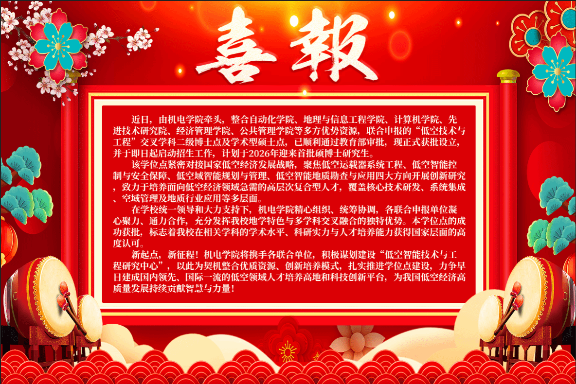 近日,由机电学院牵头,整合自动化学院、地理与信息工程学院、计算机学院、先进技术研究院、经济管理学院、公共管理学院等多方优势资源,联合申报的“低空技术与工程”交叉学科二级博士点及学术型硕士点,已顺利通过教育部审批,现正式获批设立,并于即日起启动招生工作,计划于2026年迎来首批硕博士研究生。