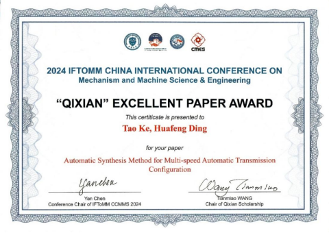 博士生柯涛和导师丁华锋教授的论文《Automatic Synthesis Method for Multi-speed Automatic Transmission Configuration》获评“启先最佳论文奖”。 柯涛为第一作者,丁华锋为通讯作者。