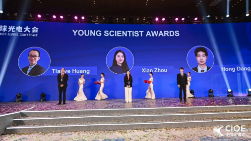 黄田野教授因其在光纤激光与传感技术领域的卓越贡献,荣获本年度光电大会青年科学家奖(共三名)。香港工程科学院院士、美国国家工程院院士、香港科技大学刘纪美教授向黄田野教授颁发了青年科学家奖状和奖杯。