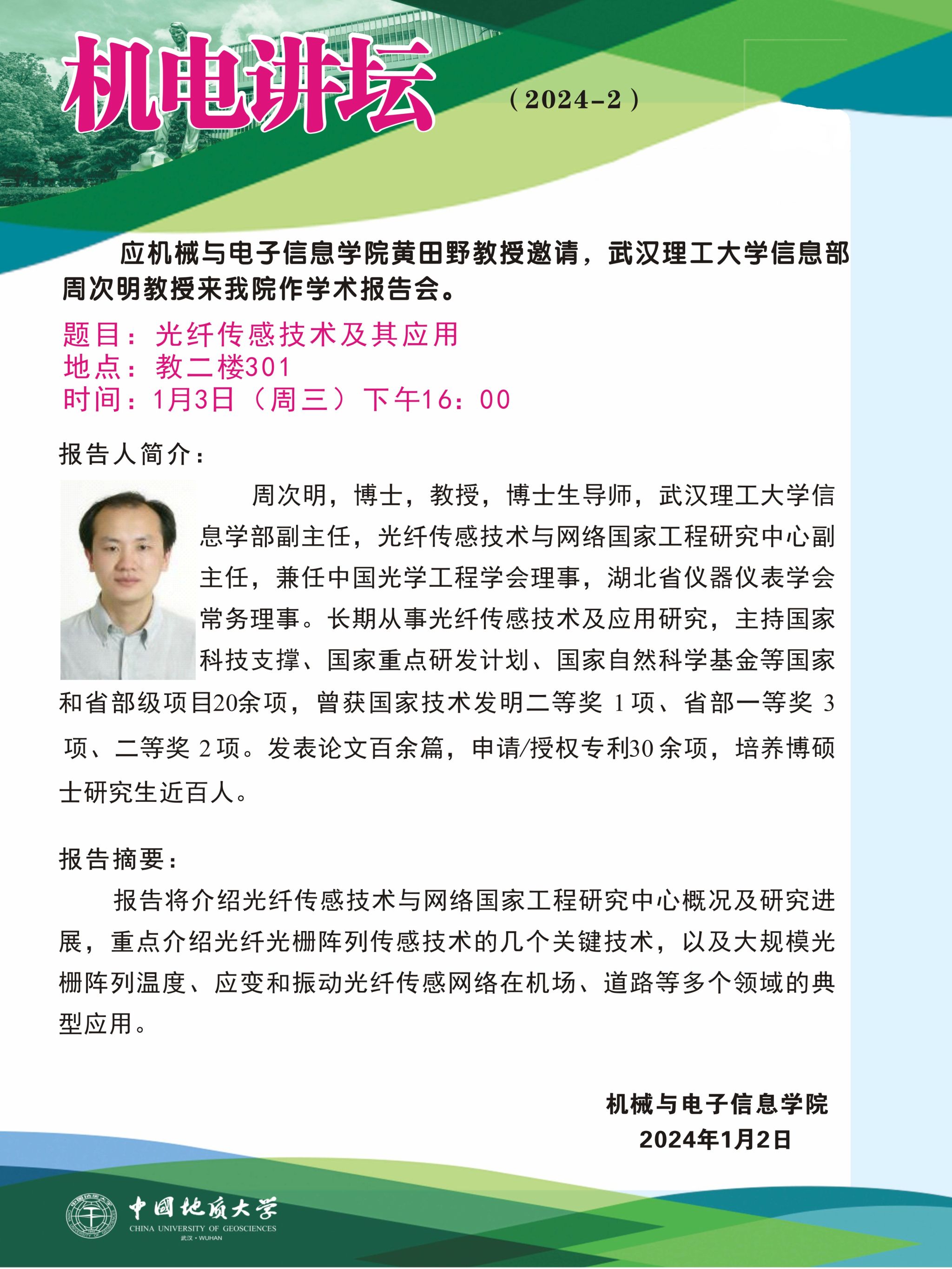 【1月3日】机电讲坛(2024-2):武汉理工大学信息部周次明教授来我院作学术报告会