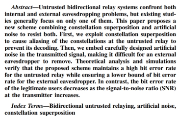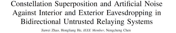 通信系2022级本科生赵家伟以第一作者在IEEE国际知名期刊IEEE Wireless Communications Letters发表题为“Constellation Superposition and Artificial Noise Against Interior and Exterior Eavesdropping in Bidirectional Untrusted Relaying Systems”的学术论文。该论文提出了基于人工噪声的星座叠加技术,为双向中继系统对抗来自内部和外部的非法窃听提供了创新性解决方案。论文的指导教师为通信系特任副教授贺宏亮。