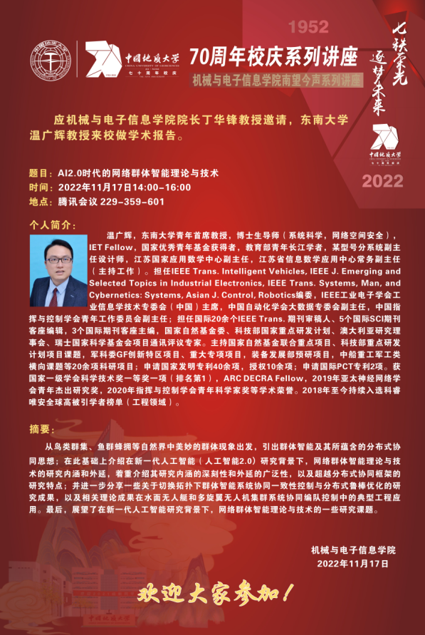 【11月17日】校庆系列学术活动---机电讲坛(2022-29):东南大学温广辉教授