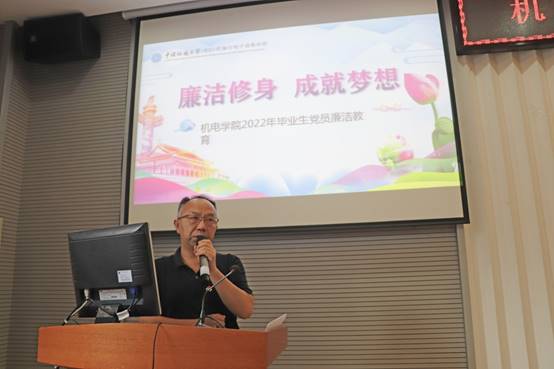 6月20日下午,机电学院2022届毕业生党员廉洁教育大会在教二楼301举行。学院党委书记瞿祥华出席大会,全体毕业生党员参加大会,学院学生党建工作辅导员刘彪主持大会。