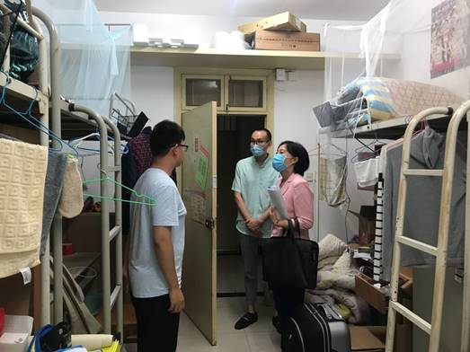 于晓舟、黄田野带队走访东区研8栋宿舍学生,详细了解学生返校后的生活情况,仔细查看学生宿舍卫生、消毒和通风情况,希望大家合理安排时间,加强锻炼,养成良好生活习惯。