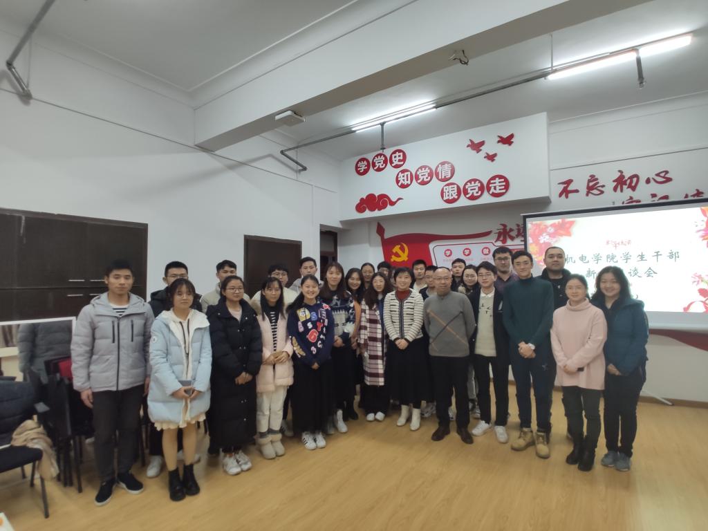 (通讯员 罗采薇)1月7日下午在教二楼308召开机电学院学生干部新年座谈会。学院党委书记瞿祥华、党委副书记于晓舟、学工组全体辅导员及各学生组织干部代表欢聚一堂,共话新年。杜育主持座谈会。