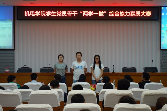 (通讯员 黄梅娇 易靓)5月18日晚7点,机电学院“两学一做”系列活动之学生党员骨干综合能力素质大赛在教二楼301举行。学工处副处长张建和老师,研工部副部长陈慧老师,党委组织部冷再心老师,机电学院党委副书记齐世学老师,学院辅导员许小康、黄梅娇、杜育担任本次大赛评委,学院本科生党支部、研究生党支部共10支队伍参赛。本次大赛由院团委书记刘强主持。