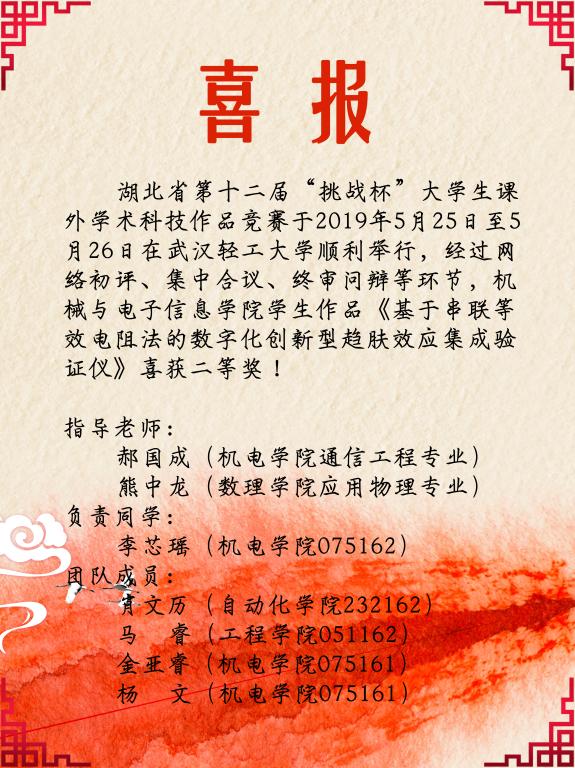 [2019年6月]我院学生作品荣获第十二届“挑战杯”湖北省二等奖
